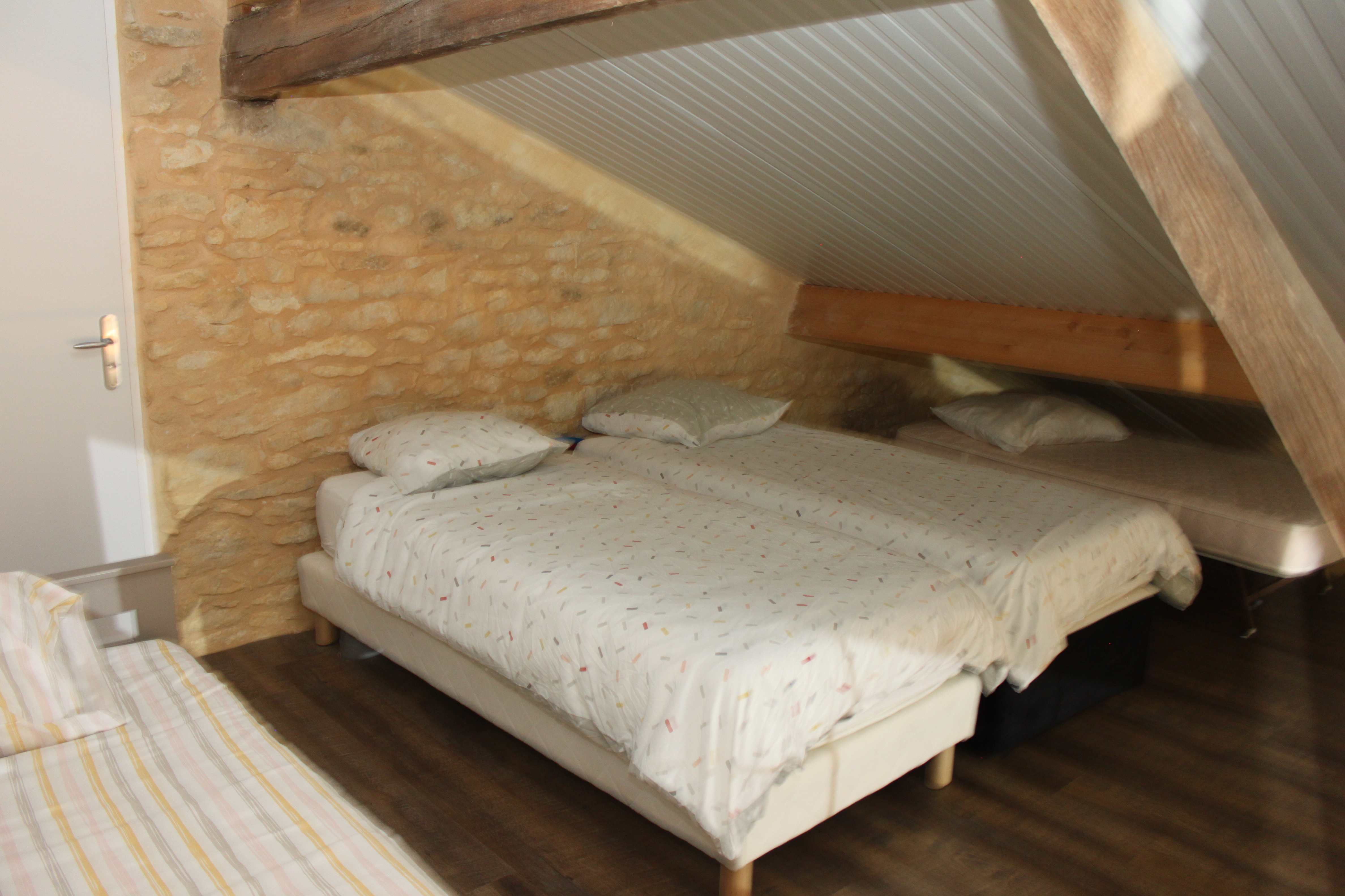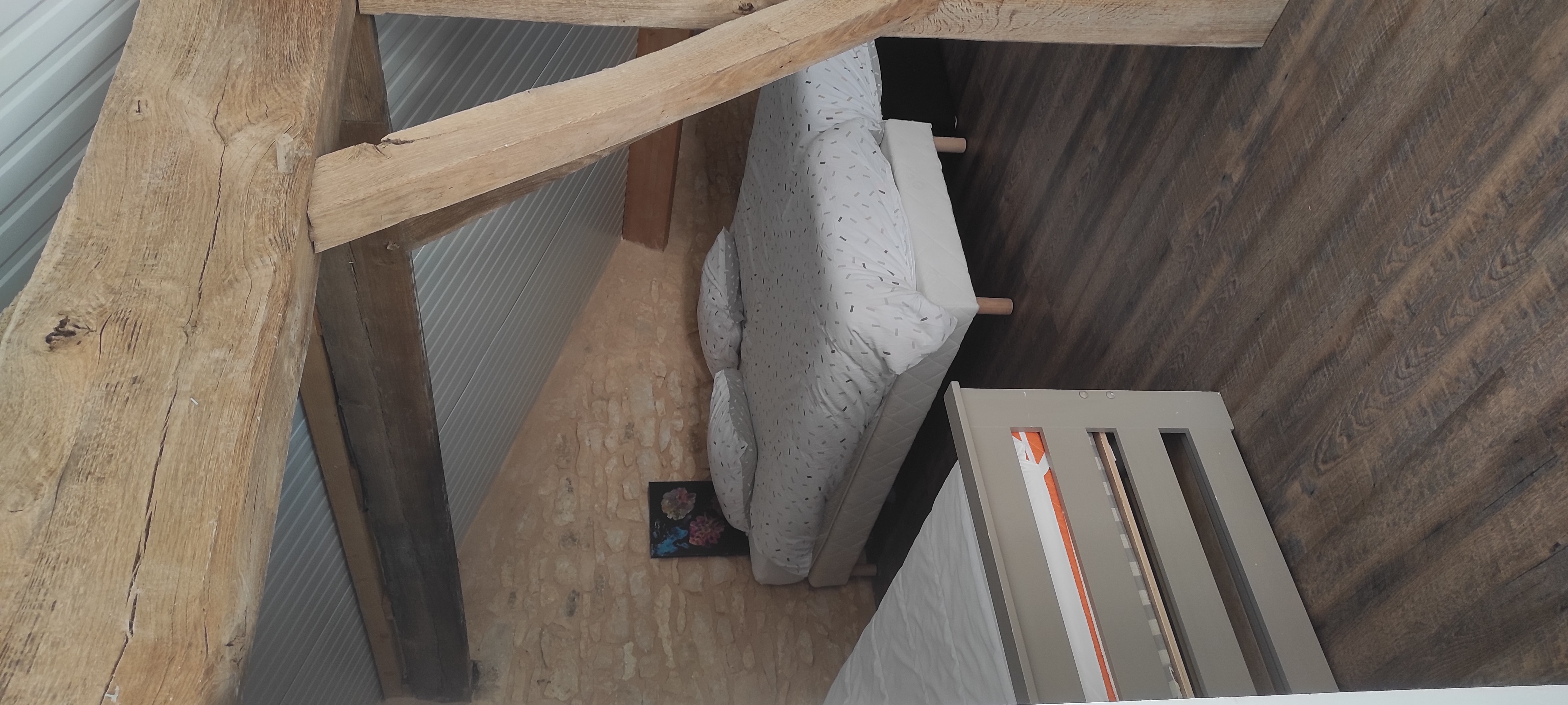 Accessible par un superbe escalier métallique, notre quatrième chambre en mezzanine offre un espace confortable et polyvalent. Nichée sous le toit, cette chambre spacieuse est aménagée avec quatre lits simples, offrant flexibilité et convivialité pour accueillir confortablement quatre personnes. Deux des lits simples sont conçus pour être facilement rapprochés, vous permettant de créer un espace plus intime si besoin. La vue depuis la mezzanine offre une perspective unique sur la pièce principale, ajoutant une touche d’originalité à cette chambre lumineuse et accueillante.