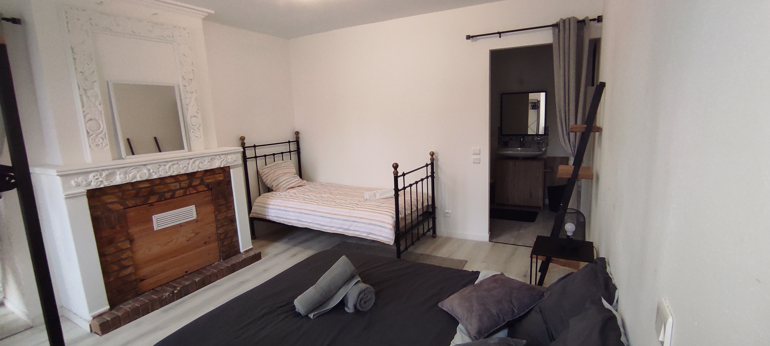 Découvrez notre spacieuse chambre principale, un havre de luxe où le confort rencontre l’élégance. Dotée d’un lit king size, cette chambre offre un espace généreux pour se détendre. Profitez de votre propre salle de bains avec douche et toilettes, offrant une intimité absolue. Les nuances apaisantes de la décoration ajoutent une touche de sérénité à votre expérience. Que ce soit pour une bonne nuit de sommeil ou un moment de tranquillité, cette chambre vous offre le meilleur du raffinement.